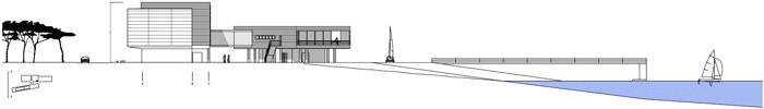 Los dos edificios se unen en planta primera por un puente-pasarela no interrumpiendo la circulación peatonal del paseo marítimo proyectado en el plan especial del eucaliptal hacia la marina seca.