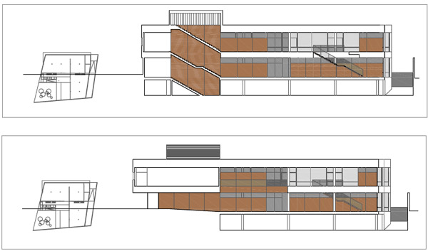 El conjunto se concibe como un edificio único con visiones transversales entre las zonas de uso público, transparencias y relaciones difusas entre interior y exterior que lo dotan de una riqueza espacial.
