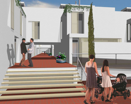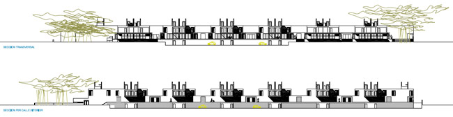 Una calle principal, y otras secundarias perpendiculares a esta articulan el espacio público que da acceso a las viviendas, conformando dos frentes principales, uno hacia el interior de la parcela y otro hacia la calle de nueva formación. A estos dos frentes vuelcan las viviendas con terrazas voladas, que mediante unas escaleras permiten el acceso a la arena.