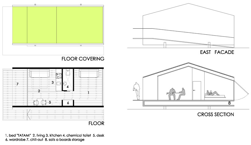 El programa, era muy similar al de una pequeña furgoneta, con zona polivalente de estar y dormir, una pequeña cocina, aseo integrado qúímico, y zona externa para almacenar las tablas, velas, mástiles y demás.