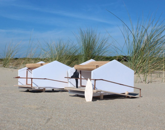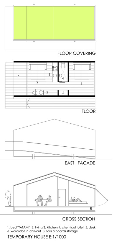 La propuesta daba respuesta con 100 pequeñas "cabañas" seriadas, orientadas a sur, y protegidas en sus laterales de los vientos de levante, fundamentalmente, y de poniente, y con vistas al estrecho y la cordillera de los Atlas en Marruecos. Las "cabañas" asentadas en las dunas, sin contacto con la arena para proteger del frío y calor, y con materiales livianos, fáciles de desmontar del tipo perfiles de acero conformados, tableros OSB, policarbonatos, etc; contaba con dos configuraciones, una con cubriciones o techos de EFTE a modo de velas integradas en el paisaje de los kites y las tablas de windsurfing, con colores similares, y que se pudieran "arbolar y desarbolar" para protegerse del sol o contemplar estrellas y otra más atemporal y tradicional con rollizos de cañizo propia de la zona que funcionaba de forma similar.